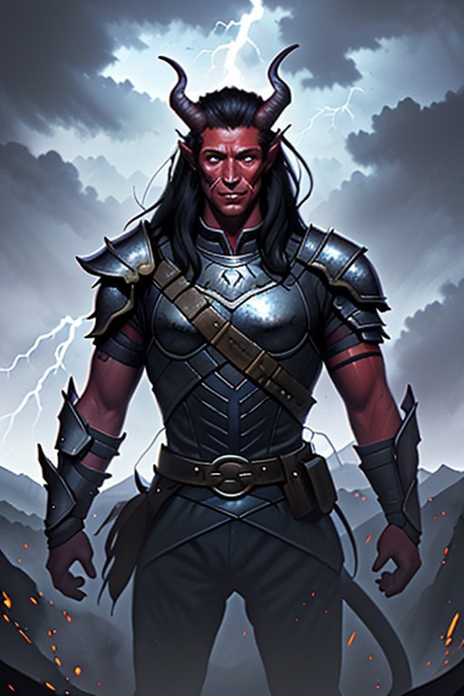 Tiefling covered in lightning, glowing blue eyes, casting a blue lightning spell, male, horns, male focus, solo, colored skin, red skin, armor, tail, shoulder armor, pauldrons, belt, closed mouth, black hair, demon, stormcloud background, long hair , ((masterpiece, best quality)), art by greg rutkowski <lora:tiefling_offset:1>