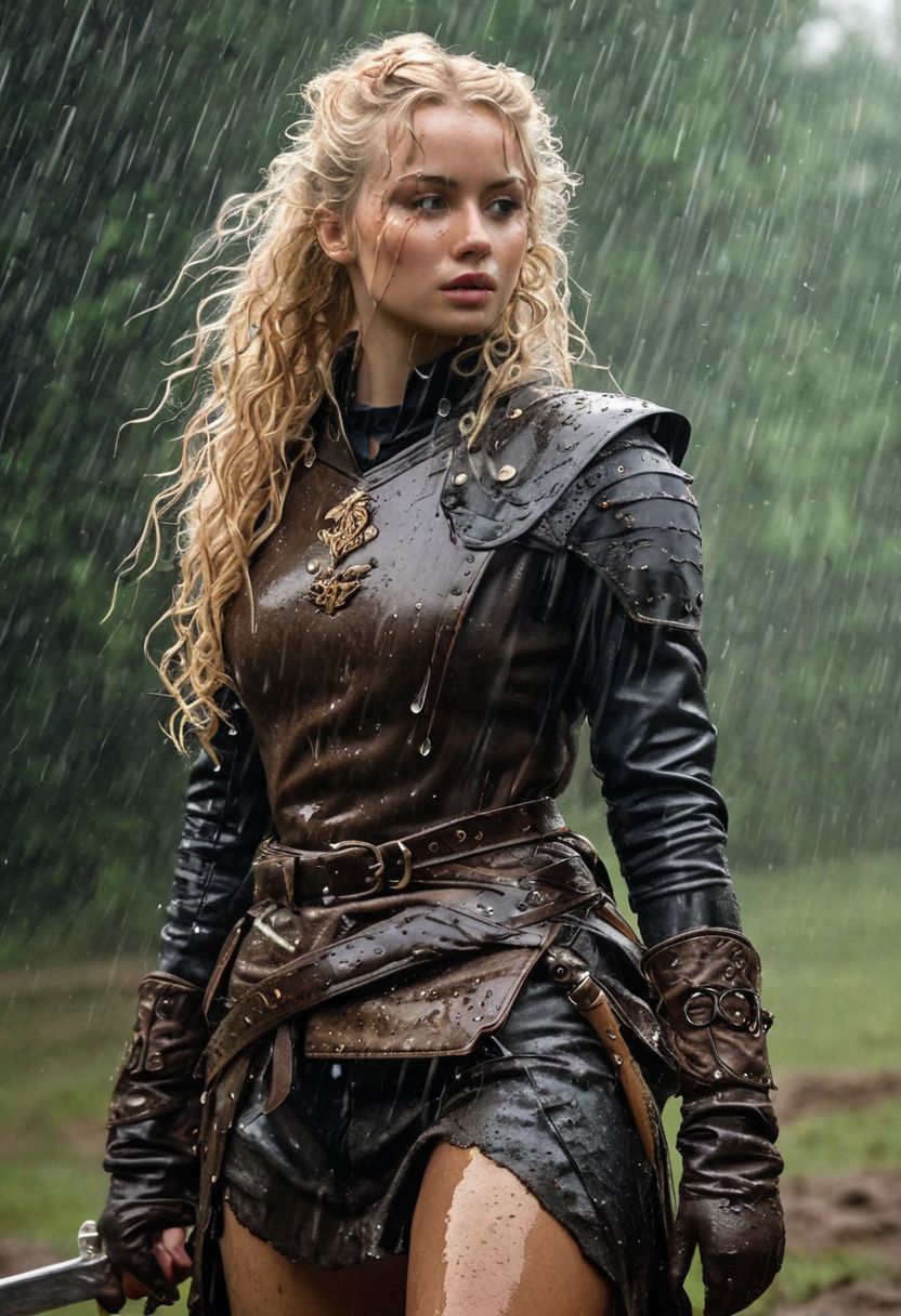 full-body image, sexualised female polish knight, juicy lips, wet curly blonde hair, perfect beautiful face, mail loincloth, bare thighs, tall leather boots, detailed dirty damaged old armor, sword, freckles, grimy battlefield, raining, detailed hair, detailed face, detailed lustful eyes, sexy expression, metal hussar wings, sweat, muddy ground