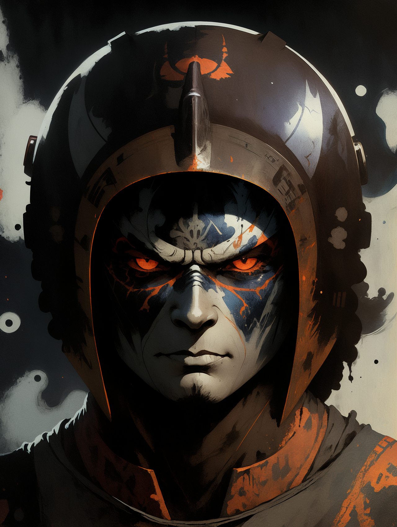 (art by Karel Thole:1.3), (in Frank Frazetta style:1.3), (Cyber Samurai:1.3), (Sumi-e Ink Painting:1.2), (intricate details:1.0), (Refined details:1.1), (best quality:1.1), (high resolution:1.2), artistic aesthetics, excellent composition
