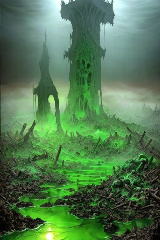 RAW photo, (masterpiece:1.3), subsurface scattering, heavy shadow, (high quality:1.4), (intricate, high detail:1.2), professional photography, HDR, High Dynamic Range, realistic, ultra realistic, photorealistic, high resolution, film photography, ambient lighting, atmospheric effects, <lora:detail_slider_v4:2>, OverallDetail, a decaying landscape full with green poisonous gas, fog, green water, skeletons, skulls, a dark tower, <lora:DeathandDecay:1>, DeDe, epiCPhoto