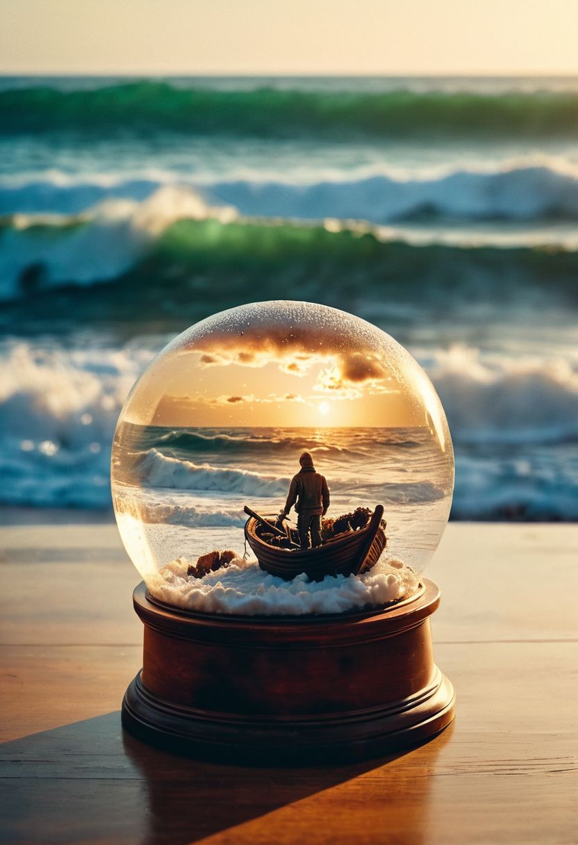 cinematic still, A snow globe with shipwrecked man calling for help inside of it on a table, large waves, best quality, highly detailed <lora:MoreArtFull_v1:0.8>, a fire place in the background, warm lightning, emotional, harmonious, vignette, highly detailed, high budget, bokeh, cinemascope, moody, epic, gorgeous, film grain, grainy