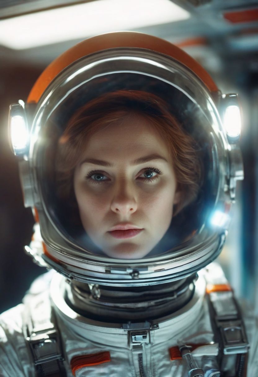 drawing style, photo with tilt shift. selective focus, thumbnail effect, blurred background, high detail, brightness, perspective control, picture with a natural tilt (whimsically artistic), charming additional,freeze frame of a science fiction film, plot - a girl in an astronaut's helmet hovers in zero gravity, space station, metal glass, reflections, ((dressed in a tight jumpsuit, in the style of the USSR)), magical, macro photography, (charming: 1.3), (luminous: 1.2), mystical, bright photography, flickering light, preoccupied, bizarre, Disturbing digital art with soft focus and excessive detail
