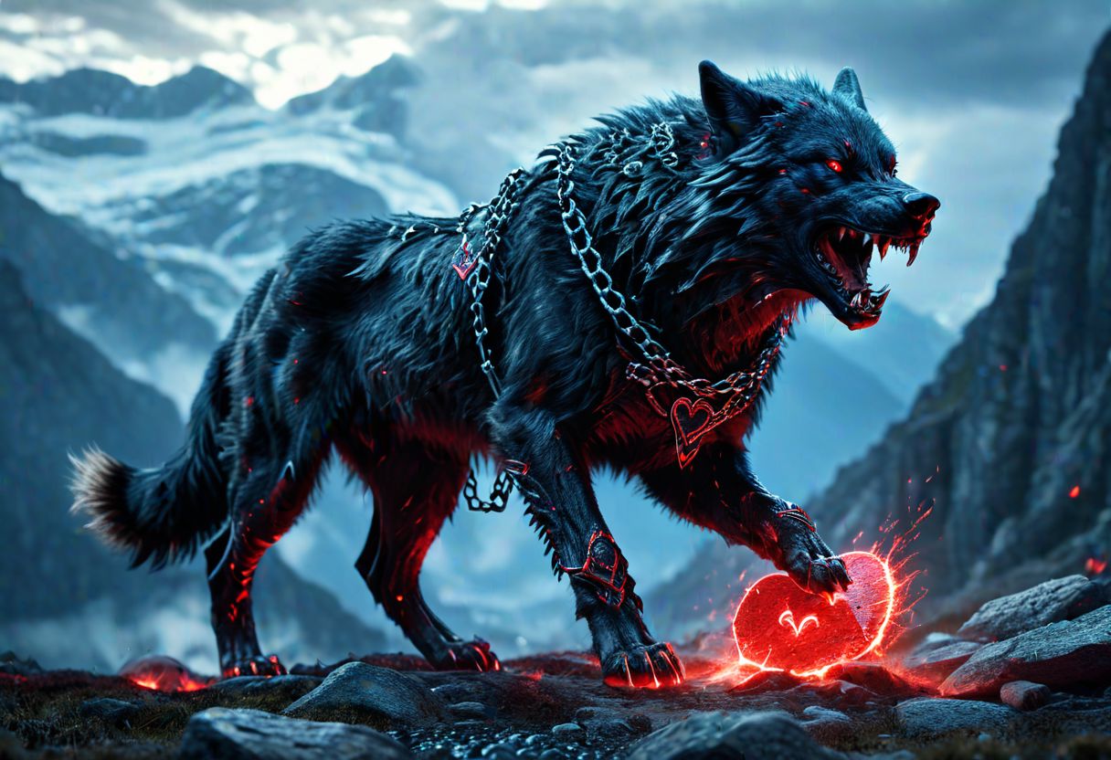 super realistic image, high quality uhd 8K, of ((a gigantic, enormous demon wolf, Fenrir)), destructive demon of Norse mythology, Ragnarok, his head bound by chains on his legs and neck, surpassing the mountains in height. ((magical hearts of light)), real vivid colors, standing