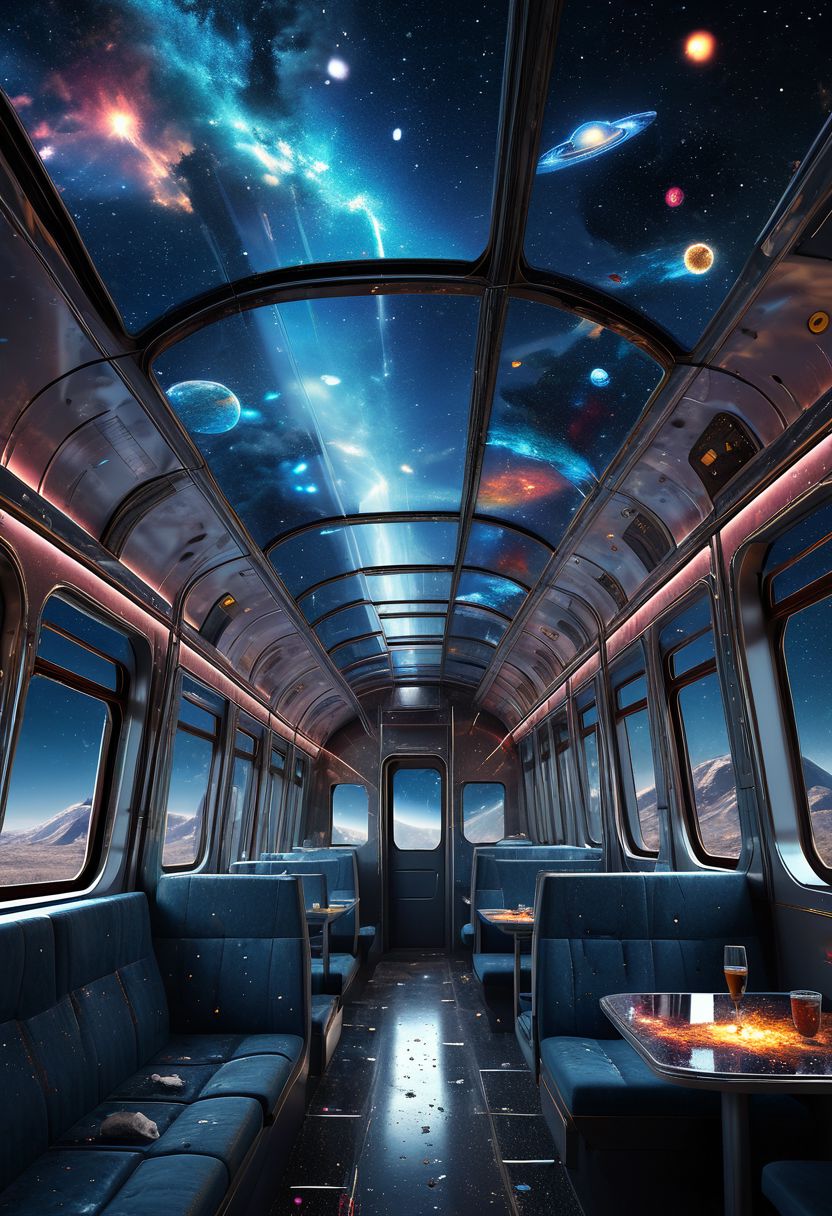 half destroyed by meteorite Hyper realistic train with transparent roof, transparent glass roof, stars of planets and galaxies outside the windows, unearthly shades of galaxies and stars, with shimmering outlines, admiring glances of passengers, huge starry sky with swirling galaxies, cosmic colors, comets, radiance, dramatic lighting , mystical atmosphere.