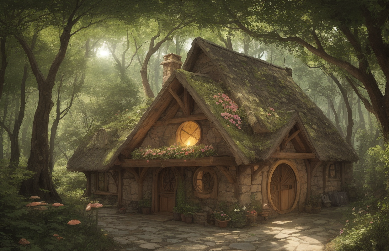 Hobbit Village, Magical forest with glowing flowers, glowing mushrooms, stone cliff, saturated clear view, sun light, round architecture Elf Lore, Hobbit Lore, Round wooden door to cozy beautiful hobbit hut, sharp quality, detailed, gold, silver, stone ([Elfpunk|Contemporary realism]:1.1) <lora:xl_more_art-full_v1:0.7> <lora:add-detail-xl:0.9> <lora:MJ52:0.6>