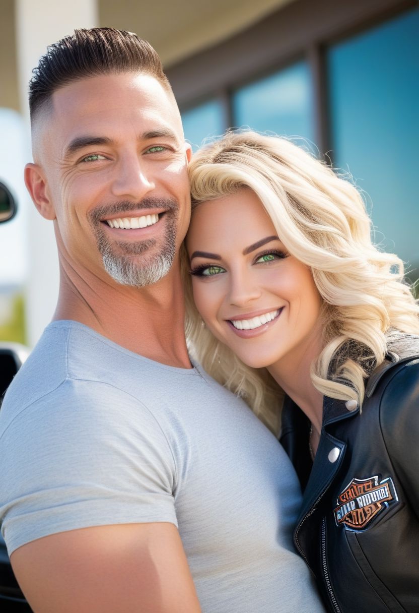 1 bald male 40 years Old ((left side)), 1 sexy female 25 years Old ((right side)), blonde hair, curly hair, messy hair, big green eyes, love, couple, happy, smile, Harley Davidson, distance view, full body