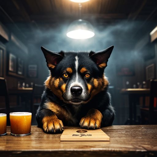red angry dog at table, yellow eyes, paws on (wooden table), lunch in pub, baked chiken on the plate, ((RESERVED sign)), looking at viewer, close up, professional light, mystical dense fog, epic scene, haunting mist,