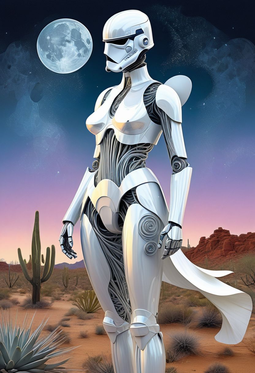 gorgeous elegant transluscent stormtrooper in the desert moonlight. Full motion. Beautiful shimmering flowing. magical trees and cacti. Highly detailed. swirling, circling. Romantic. Warm vibrant colors, Dynamic. Speed drawing. Watercolor poster art. Ink splash art. Sparkling stars. Fractals. Intricate motifs. Imaginative. Luminous colors. silver outlines. By David Mack and Yves Tanguy and Amanda Clark, golden ratio, abstract vector fractal, wave function, Zentangle, 3d shading