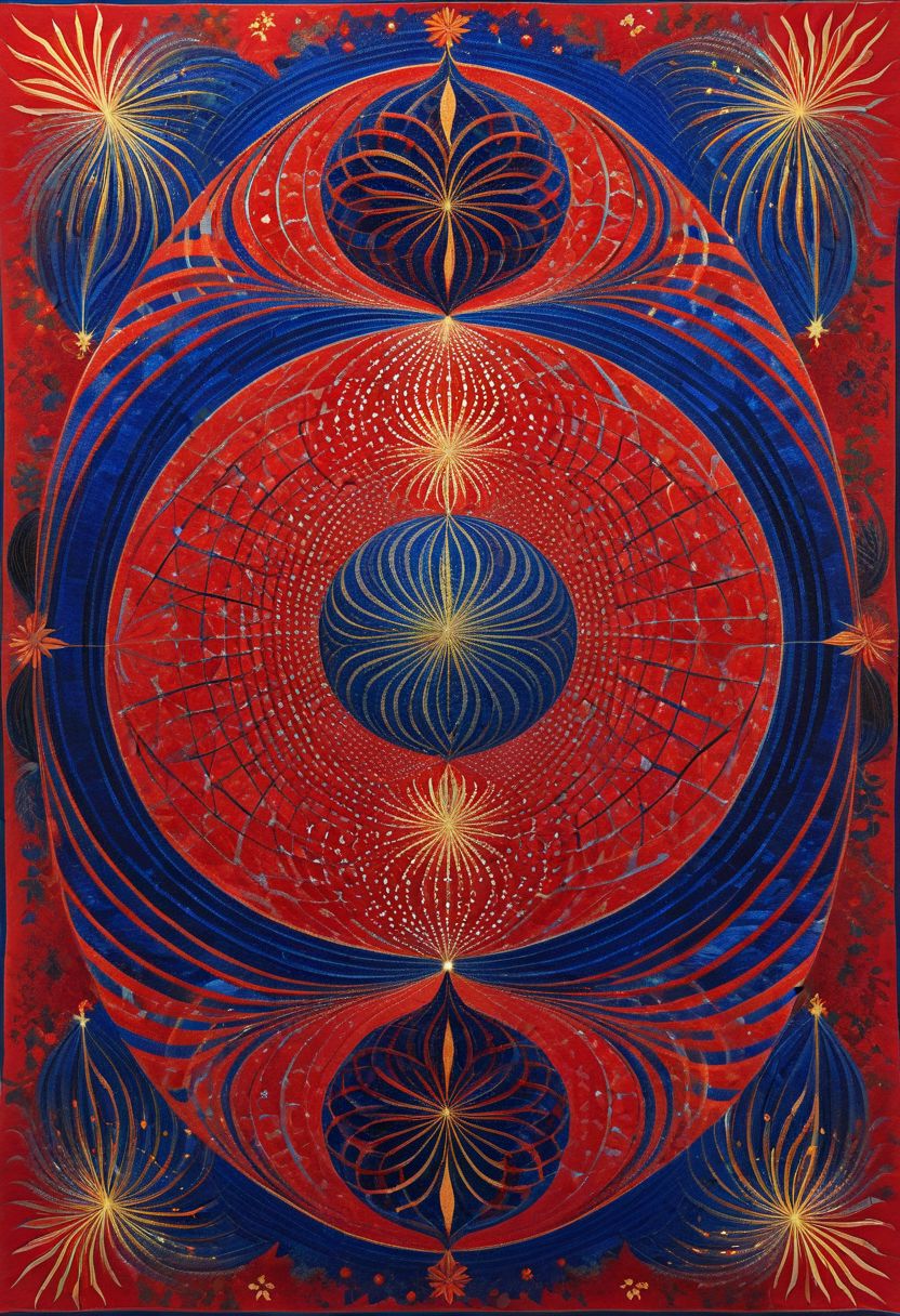 Style of Giacomo Balla, lapis lazuli stone, Haft Paykar, Nizami Ganjavi, land of darkness, recurrence, cyclic universe, cyclical, schizoanalytic cartography, aureolin color, crimson red, sharp colors, bright, splendid, mesmerizing art, ths_tapestry, Amanda Sage style, pureerosface_v1