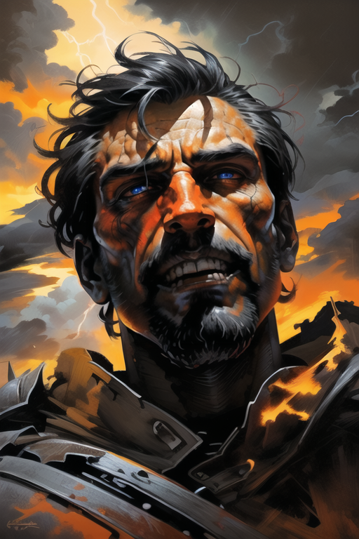 oil painting, Dramatic View, High-angle, Epic Battle, fierce knights, on a stormy battlefield, lit by flashes of lightning, contrasting shades of fiery reds and dark grays by amazing artwork by EpicBattlePainter <lora:BearlySD:0.8> <lora:Frazettta:0.9>