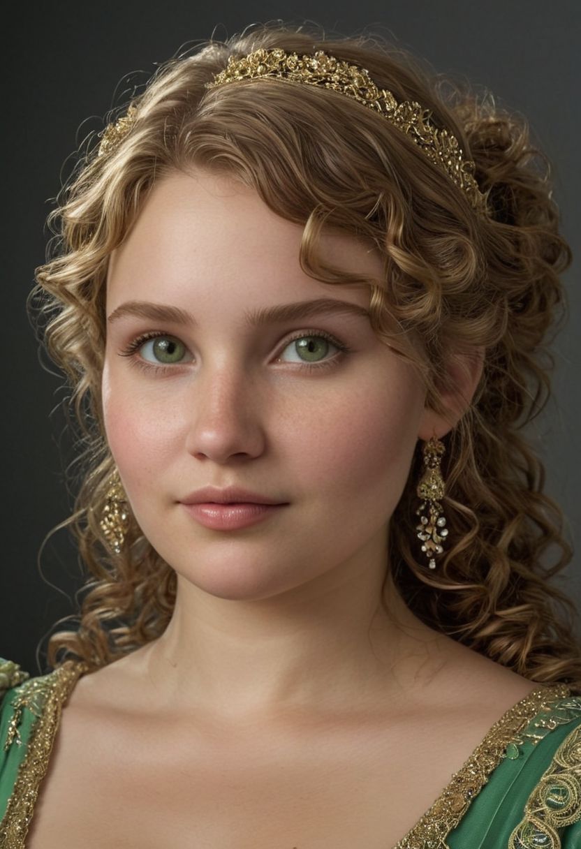 Photorealistic oil painting of (half-dragon warrior-princess:1.2) half-angloirish, 1/4desi 25%, roman nose, thin upper lip, monolid eye, arched eyebrows, dimples, big rosy cheeks, receding chin, large forhead, wide bridge nose, low cheek bones, oval face, curvy, plump, bbw, chubby, big belly, wide hips, big ass, big butt, fat, fatface, puffy lips, slightfrown, big nose, ugly, thinupperlip, wide nose, wide mouth, slightlyhomely, upper body, waste up, full upper body, torso ,with (intricate metallic brass scales seamlessly melded into arm and neck:0.9), 18-year-old, (light brown curly hair:1.1) half-angloirish, 1/4desi 25%, curvy, plump, bbw, chubby, fat, fatface, puffy lips, slightfrown, big nose, thinupperlip, wide nose, wide mouth, slightlyhomely, upper body, waste up, subtle smile, pointy nose, high cheek bones, negative canthal tilt (bare shoulder:1.3), (medieval fantasy clothing:1.2), grimdark fantasy, (medieval) fantasy, high fantasy, epic fantasy, (upper body:1.3) (medium shot:1.3) taken with (fujifilm xt3:1.1), film grain, dark style, raking light dramatic hard shadows, (dramatic lighting:0.9), material contrast, cinematic composition, intricate details, masterpiece, visually stunning, evocative, vivid deep hues, brass, green chalcedony, (body transformation:1.2), <dhevv:ds-style:rsd1.5>, realistic eyes, scaleborn, scales, woman, busty, huge boobs, bangs, small barrette , subtle smile,