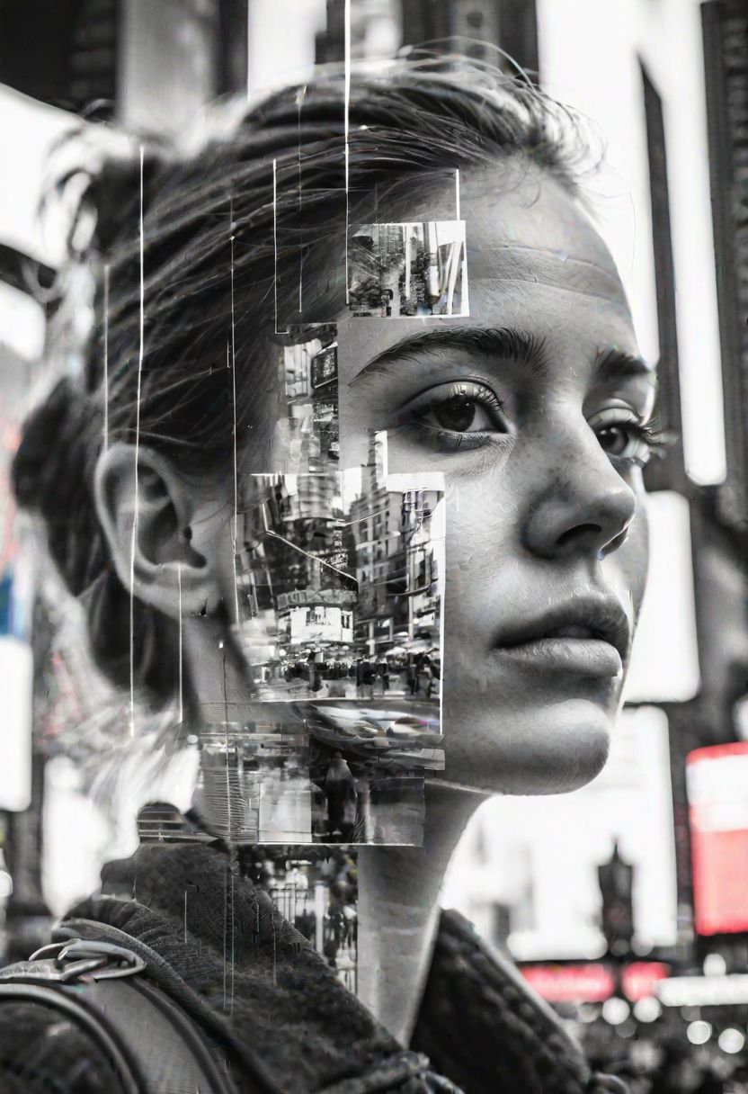 double exposure portrait, black and white, 23yo woman walking through Times Square