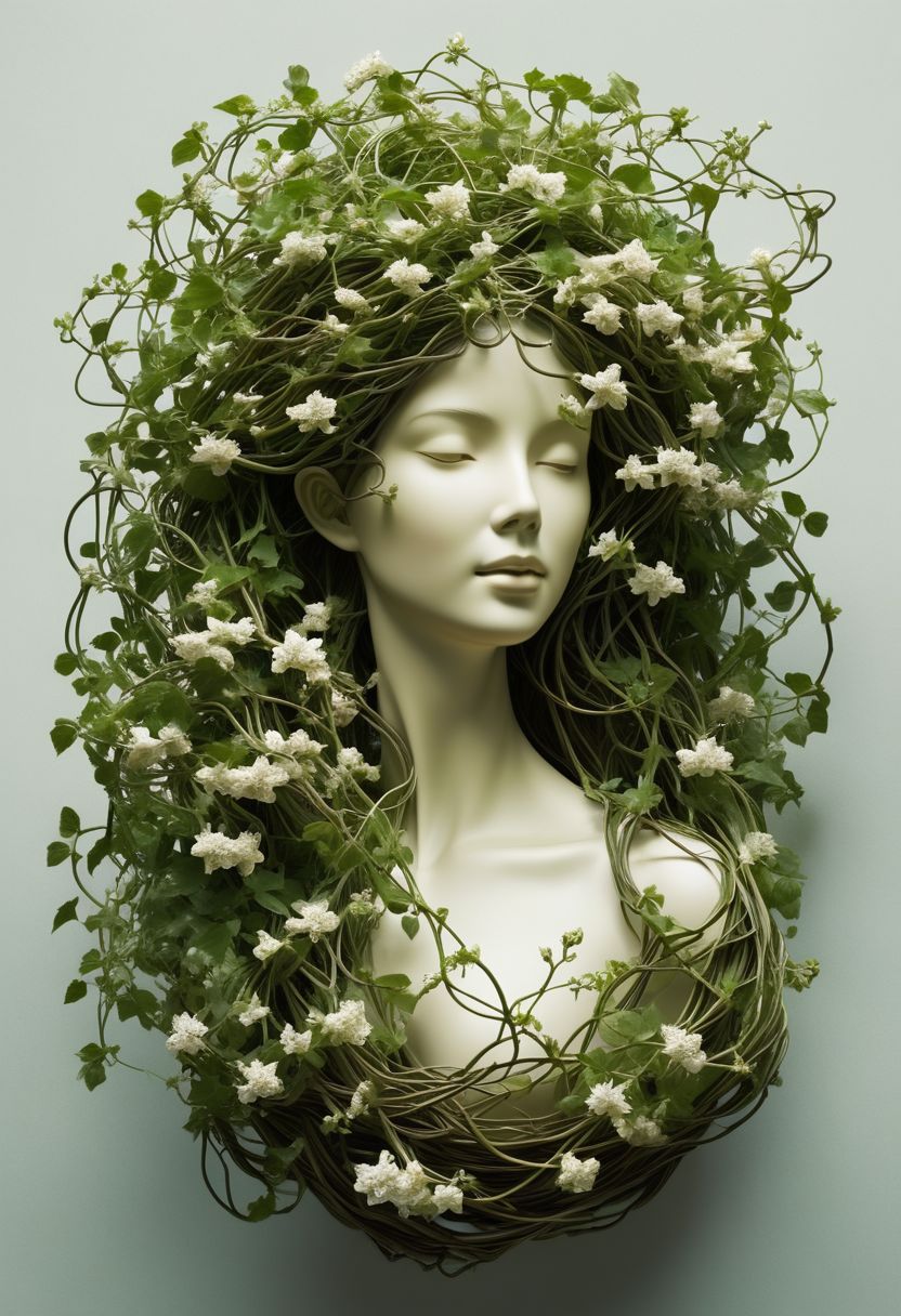 a cluster of vines tangling together into the form of a shapely woman, clusters of blossoms for her hair