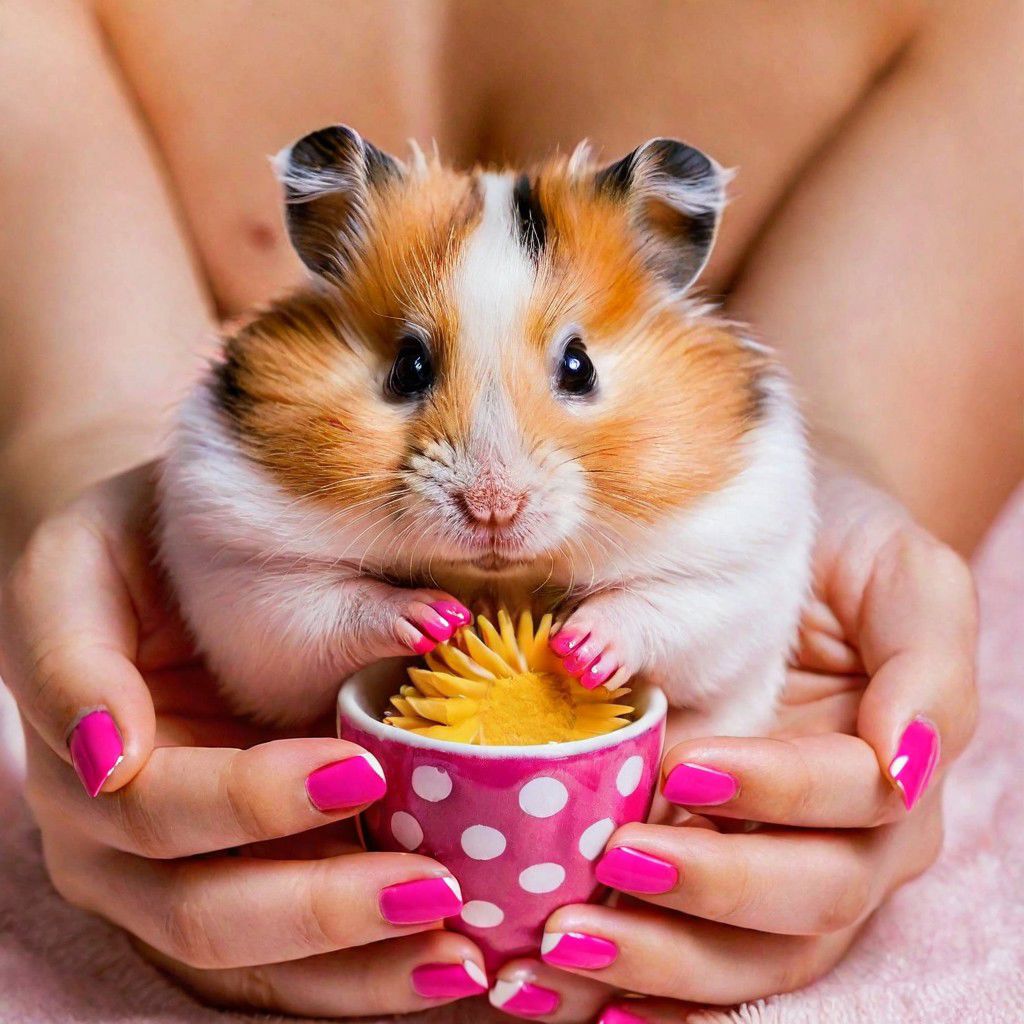small cute hamster, held in cupped Perfect Hands, colorful painted nails, hair comb