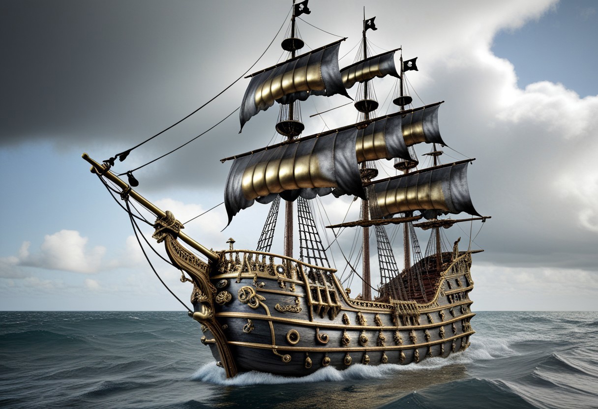 qu4ntum, Silver and brass punk Pirate ship, epic, high seas, cloudy mid day, high quality, detailed, realistic, photograph, afternoon lighting