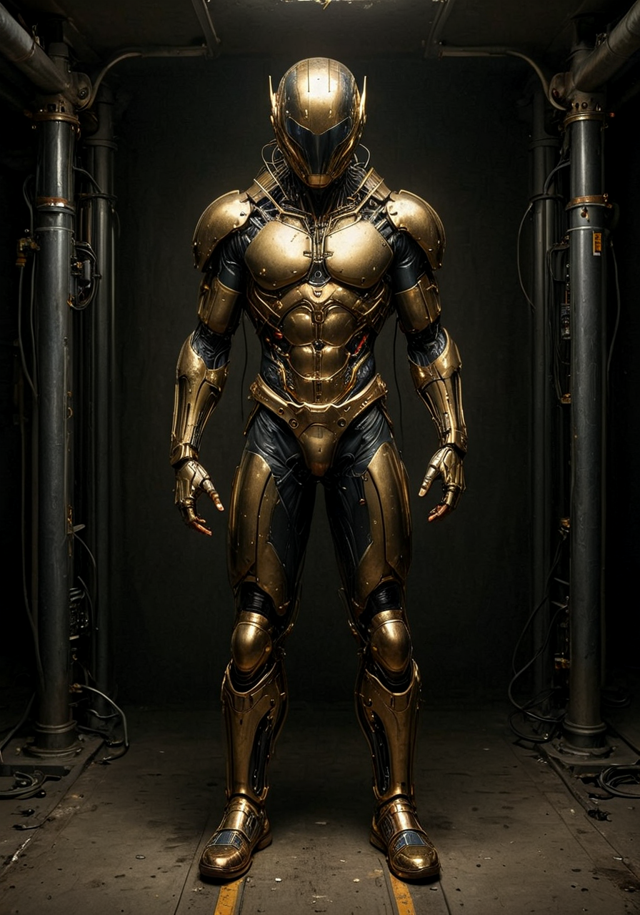 photo of aqu4ntum style of a warrior, covered in (brass pipes) and (silver circuit wire). chiaroscuro, dark scene, dim lit, (In a futuristic laboratory, intricate background, full of strange devices with metal tubes.) Full of details. Dynamic scene, movement., , qu4ntum, flux-style<lora:- SDXL - vanta-black_contrast_V3.0.safetensors:0.5:0.5> <lora:Qu4ntumPunk_XL-SGX.safetensors:0.9:0.9> <lora:aidmaFluxStyleXL-v0.2.safetensors:0.4:0.4>