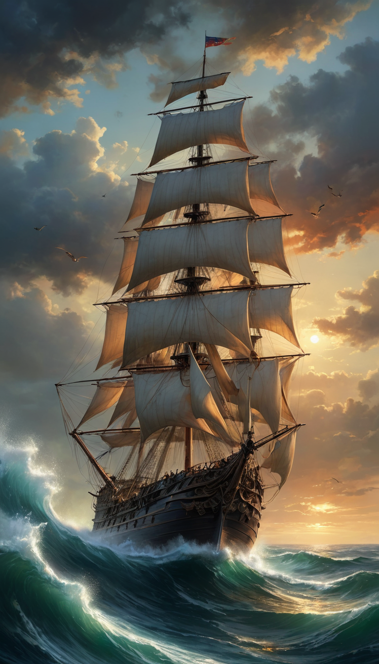 (masterpiece, best quality:1.4),art by Aleksi Briclot Images The "Queen Anne's Revenge" sailing majestically across the sea, with her sails unfurled