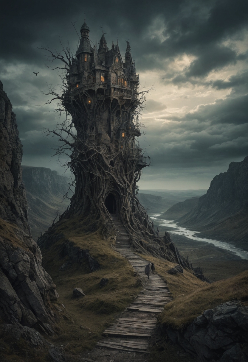 Horror-themed, Surrealism, ultimate Surreal Art, ultimate strange art, ultimate ultimate metallic and cool color, ultimate strange details of the landscape, The theme is "A journey of a thousand miles begins with a single step." <lora:add-detail-xl:1>б, expressive, dramatic, organic lines and forms, dreamlike and mysterious, Surrealism, Eerie, unsettling, dark, spooky, suspenseful, grim, highly detailed