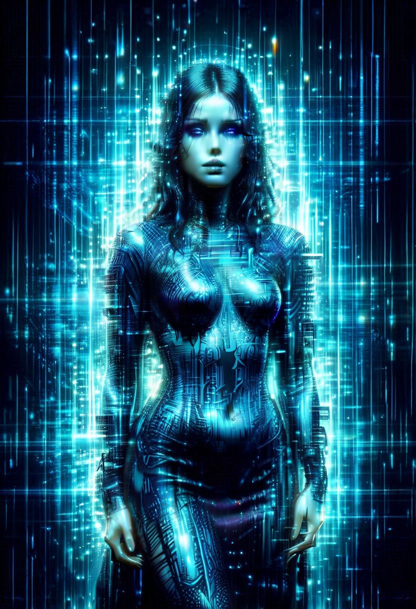 UHD, 4k, ultra detailed, Luis Royo, dark fantasy art of blue female hologram, Cortana, full body, blue face and hair, (wearing digiatl pattern cocktail dress:1.2), looking at viewer, body covered in intricate patterns and designs, digital flickering hologram, glitch style hologram,