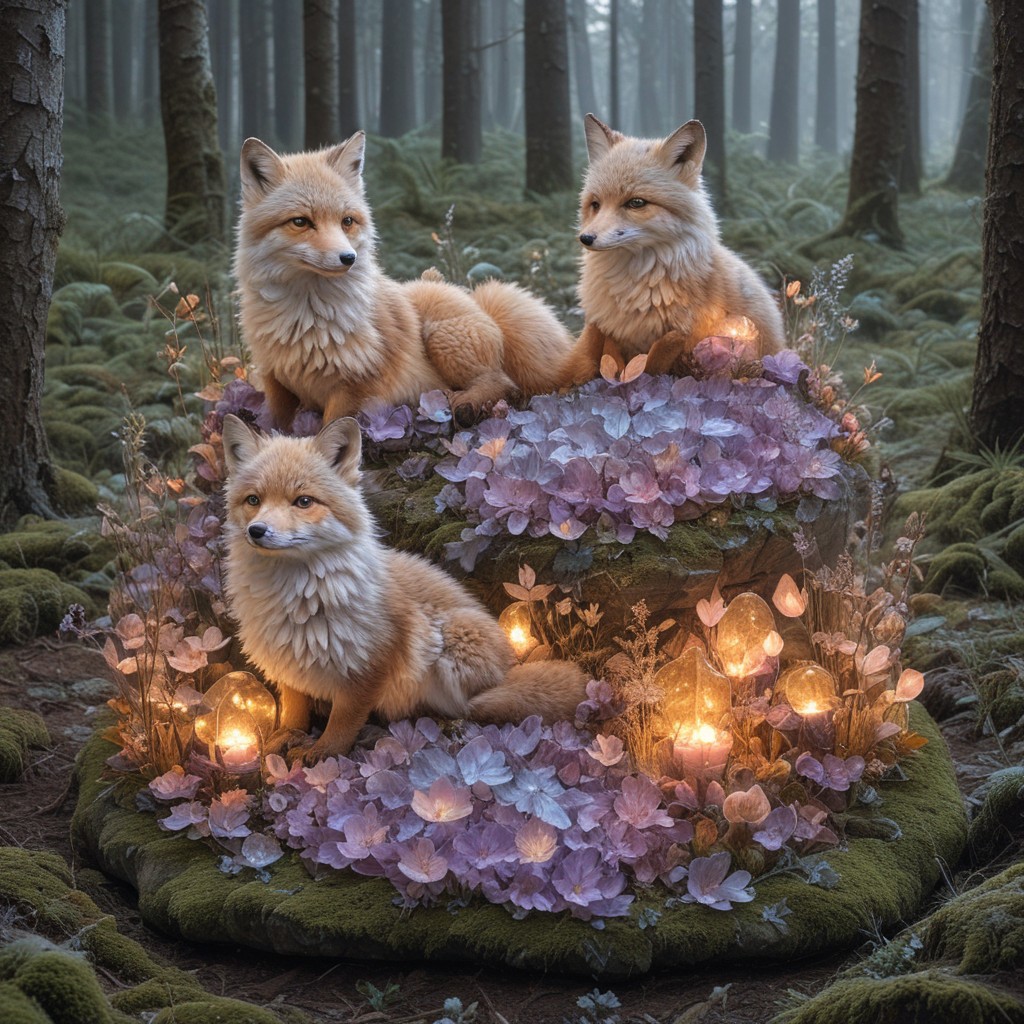 (photorealistic), <lora:Fluorite_Mineral_SDXL:1> fluorite mineral A cozy forest clearing bathed in soft morning light, with a family of foxes curled up together on a bed of moss. The scene is serene and heartwarming, with delicate flowers and tiny mushrooms dotting the ground
