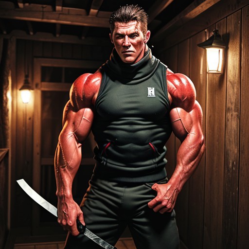 photograph, of a glistening sweaty skin, very tall lean muscular man Jason Vorhees in a tightsleeveless jacket that is unbuttoned that shows off his massive pecs and he wears a hockey goalie mask. He has a monstrously huge bulge in his crotch,18yo, Scandinavian bodybuilder with a narrow waist and narrow hips and is very vascular. He stands in the middle of a cabin at night, and he holds a machete in his hand
