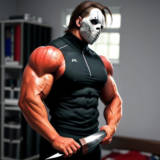 photograph, side view, glistening sweaty skin, very tall lean muscular man Michael Myers in tight grey sleeveless mehanic's uniform that is partiall unzipped shoing off his massive pecs. He is wearing a Michael Myers mask r. He has a huge bulge in crotch,18yo, Scandinavian bodybuilder with a narrow waist and narrow hips and is very vascular. He stands in the middle of a bedroom at night holding the handle of a butcherr’s knife in his hand.