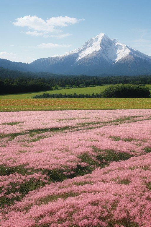 A snowy mountain range with soft pink clouds above it. A field of flowers stretching out below, soft pastel anime