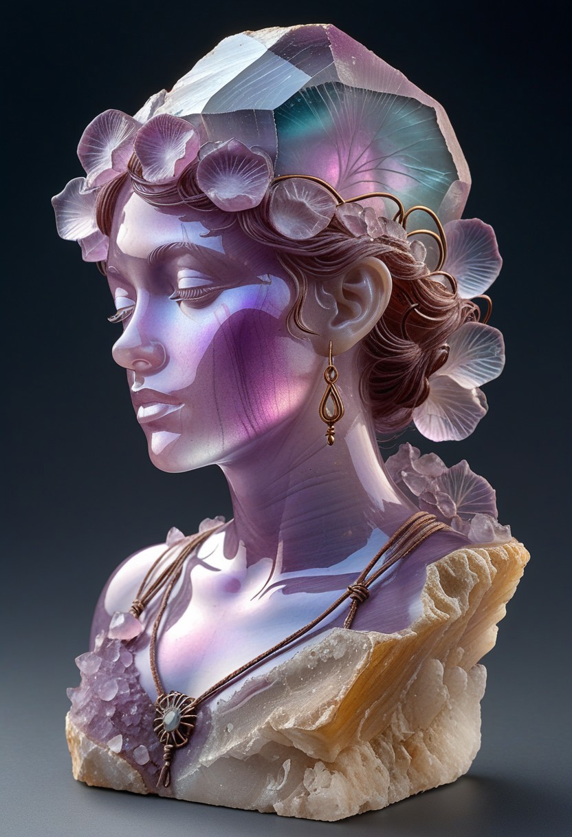 (photorealistic), <lora:Fluorite_Mineral_SDXL:1> fluorite mineral, iridiscent, flu0rite woman at art nouveau style