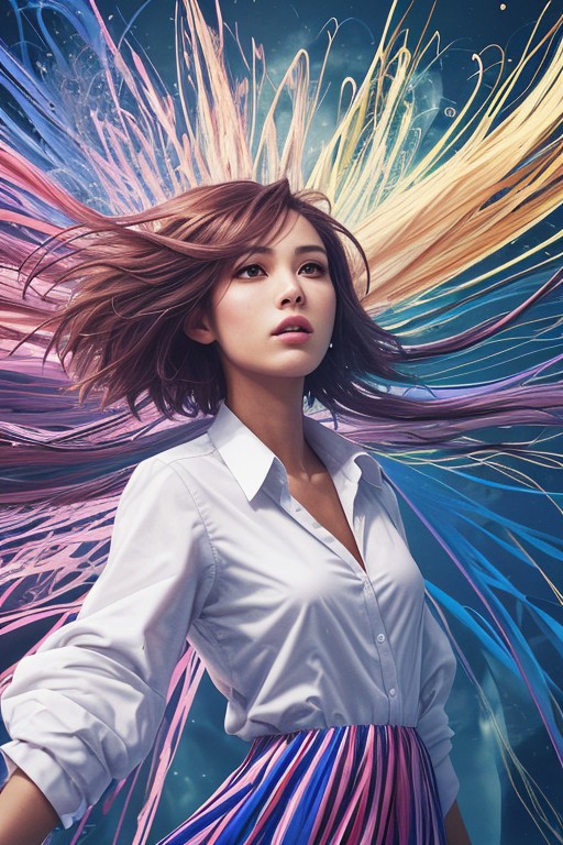 masterpiece, best quality, newest, absurdres, highres, 1girl, small breasts, short hair, hair in the wind, dress shirt, wild abstract background, jaggy lines, shadows, pink and blues, ultraviolet light, light particles