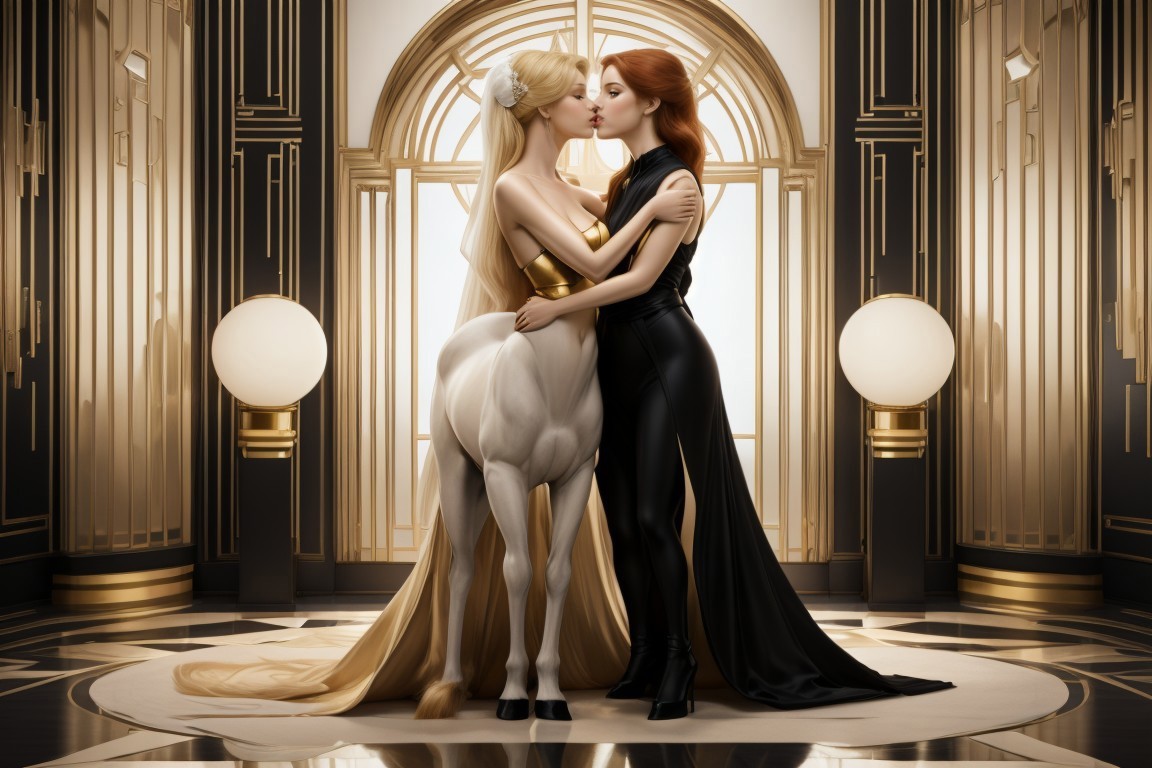 2centaurs, photograph, photo quality, (mythical female centaur, hooves, (((each has exactly four legs in proper anatomical position))), face-to-face, ((redhead)), ((blonde)), very long gold tail) in deco_blackgold wedding dresses, with hair in a ponytail, veils pulled back behind their heads, art_deco_fusion, in front of an altar in an art_deco_fusion cathedral, hugging, (lovers kissing passionately on the lips, deep kiss), two female centaurs being wed, score_9, score_8_up, score_7_up, happy, smiling, overjoyed, exquisitely beautiful, from side