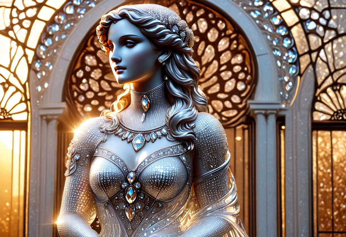 TI, A centrally focused image of a lovely statue of a goddess, in countless sparkling diamonds, posed in an art nouveau manner, with the windows and pillars of that style surrounding her beautiful transparent full body sculpture glittering in the sunlight. BREAK diamondMW, ArsMJStyle, cryst@l, s1lv3rblu3, masterpiece, best quality, hyper-realistic, ultra-HD, intricate textures, luminous lighting, cinematic ambiance, shimmering gradients, ethereal glow, deep contrast, soft volumetric fog, subtle particles, radiant reflections, rich color tones, seductive atmosphere, captivating sensuality, Cinematic Lighting, Shadow, backlit, backlighting, BREAK raytracing, volumetric lighting, ambient occlusion, shimmering particles in the air, intricate cinematic background, Transparent glass, Transparent dress