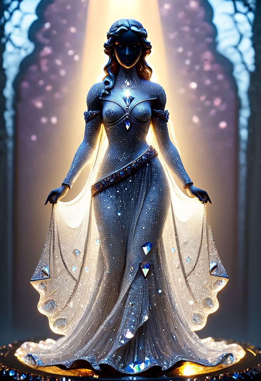 TI, female goddess statue made of diamond, transparent, holding diamond sword, rainbows, refraction, porcelain skin, stoic expression, dynamic angle, unique perspective, rating:general BREAK diamondMW, ArsMJStyle, cryst@l, s1lv3rblu3, masterpiece, best quality, hyper-realistic, ultra-HD, intricate textures, luminous lighting, cinematic ambiance, shimmering gradients, ethereal glow, deep contrast, soft volumetric fog, subtle particles, radiant reflections, rich color tones, seductive atmosphere, captivating sensuality, Cinematic Lighting, Shadow, backlit, backlighting, BREAK raytracing, volumetric lighting, ambient occlusion, shimmering particles in the air, intricate cinematic background, Transparent glass, Transparent dress masterpiece, best quality, amazing quality, very aesthetic, absurdres,