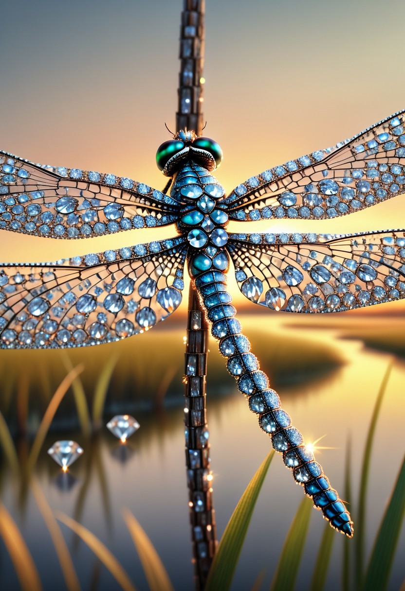 masterpiece, photorealistic, extreme closeup, dragonfly made of countless diamonds, glistening, sparkly, depth of field, marsh background, sunset