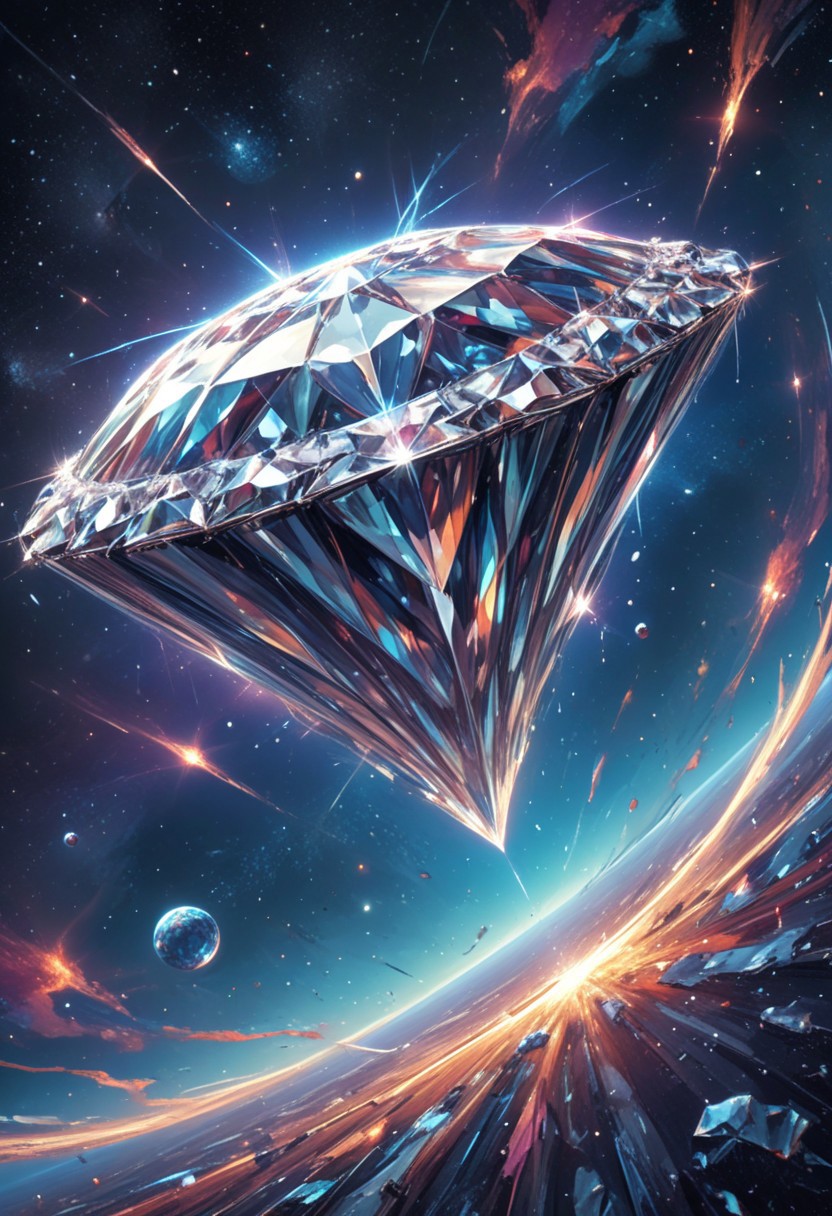 Realistic image, photo quality, outer space, distant stars,, planets, ((one diamond)) A high-angle perspective futuristic sci-fi style abstract artwork featuring vibrant colors, bold shapes, and overlapping Dynamic digital sketch, loose painterly strokes,