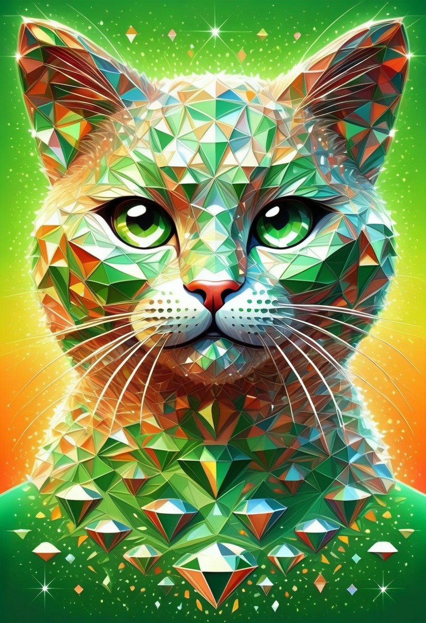 abstract expressionist painting Pop Art and cubism early 20 , straight lines and solids, cute cat face without body made of diamonds, warm colors, green, intricate details, hologram floating in space, a vibrant digital illustration, dribbble, quantum wavetracing, behance hd, vivid colors, flat color, 2D, strong lines, Pop Art . energetic brushwork, bold colors, abstract forms, expressive, emotional