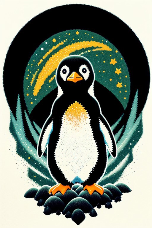 sfw. pointillism art. spaced point, vivid colors. ((penguin silhouette)) . dramatic blue green orange split-tone lighting, black background