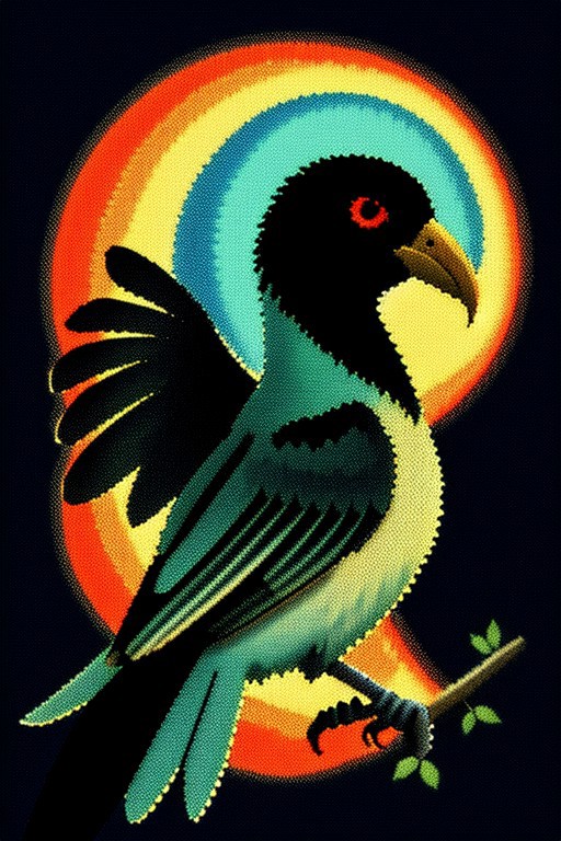 sfw. pointillism art. spaced point, vivid colors. ((bird silhouette)) . dramatic blue green orange split-tone lighting, black background