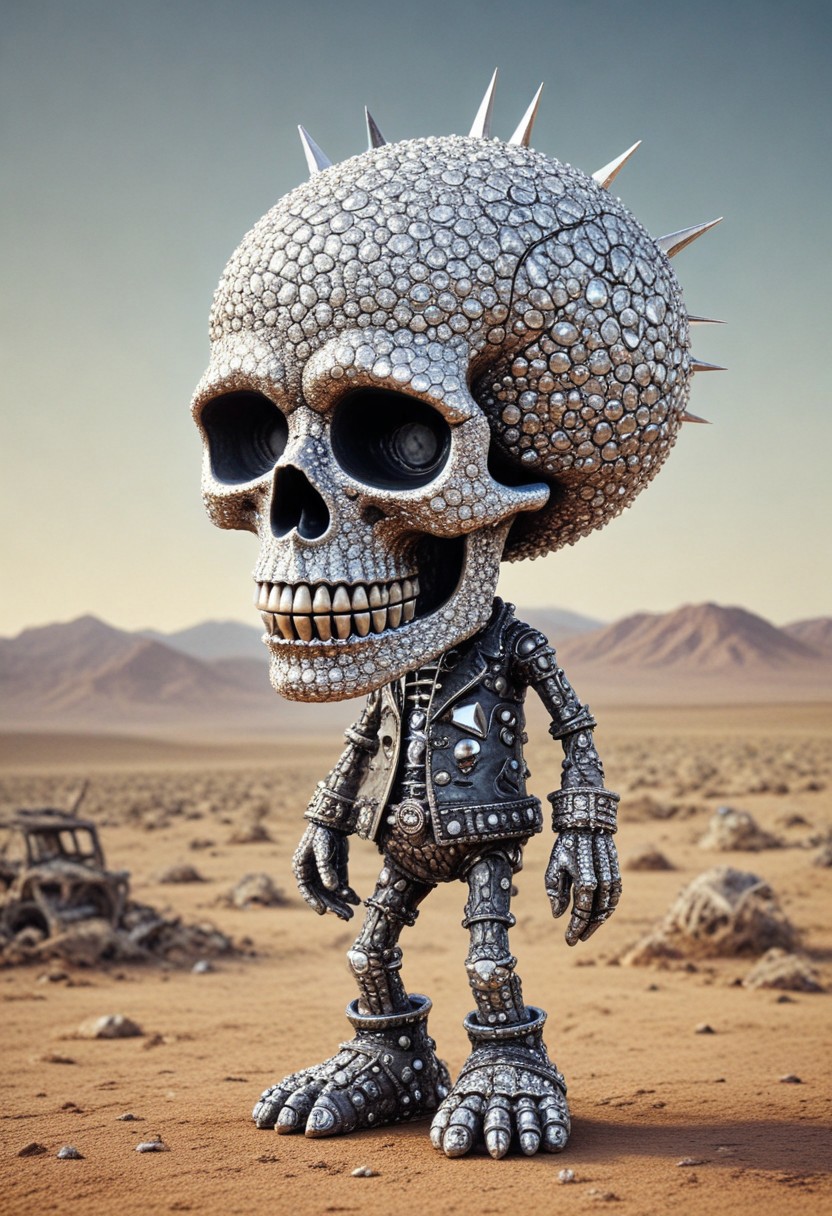 illustration inspired by Tim Burton and Skottie Young, deadly punk carnival diamondMW skull in the mojave desert urban countless diamonds wasteland, apocalyptic background, diamondMW, countless diamonds