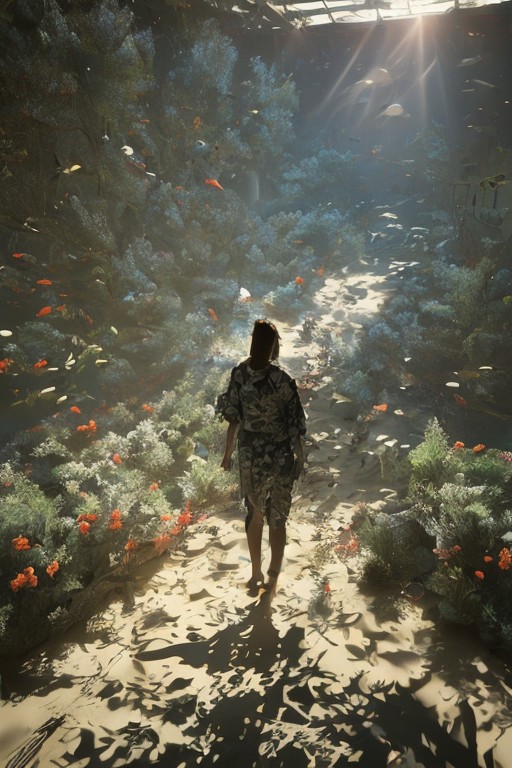 Poster, art by Felix Kelly, extreme wide shot of a figure facing away, wearing a hoodie made of kelp with the hood up, weights tied around ankles, walking through a valley with steep sides of multicolored lush underwater jungle with dynamic lighting, dappled lighting highlights a long walking stick with kelp decorating the top, deep shadows, bright colorful highlights, glowing elements, vibrant colors, Screen print, Rembrandt lighting, anaglyph filter <lora:post00d-000010:1>