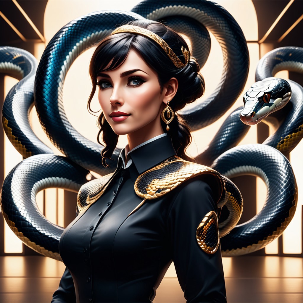 sfw, score_9, score_8_up, score_8, score_7_up, score_7, (best quality), Source_cartoon, 1girl, mature female, gorgeous older woman, 45 year old anthropomorphic snake woman, expressive eyes, delighted expression, high cheekbones, black hair, ((Updo hairstyle)), hoop earrings, jewelry, blue shirt, black suit, formal, black pencil skirt, black high heels, sn4ke, Rating _PG