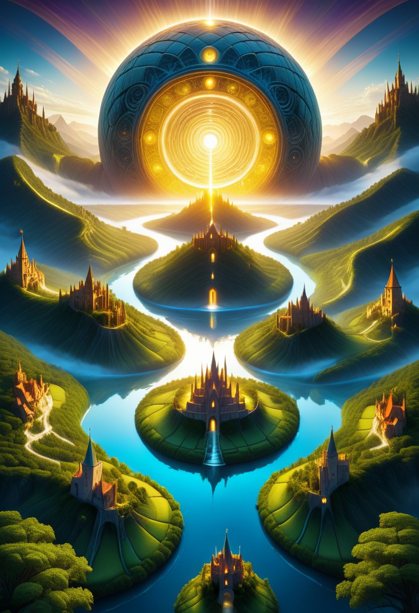 The great sn4ke encircling the earth, its body glowing with mystical symbols, supporting a vast and harmonious world, with villages, forests, and rivers thriving under a golden sunset.