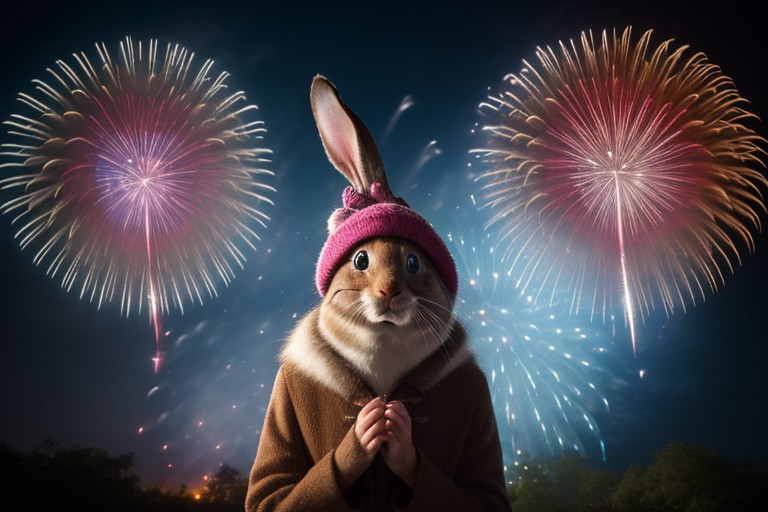 A happy cute, (bunny), (wearing a winter hat), two ears, Adorable, heart warming, cheerful, detailed, bright colours, friendly expression, small size, shiny, eco-friendly, garden, (winter), (fireworks), environmental, sunlight, shadows, digital art, whimsical, playful, intricate details, high resolution, photorealistic, joyful atmosphere, gentle, soft lighting, cartoonish style, enchanting, vivid, appealing, character design, imaginative, family-friendly, [photography, realistic, photorealistic, (8k), (highly detailed), cinematic lighting, intricate details, (high resolution), award-winning, correct focus, realistic, realistic lighting, (highly detailed), masterpiece], ((Cinematic Still-Shot)), Chr457m45m3rg3D0nMN3M1C neon,