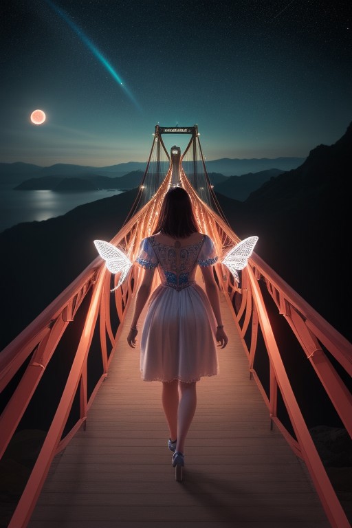 mega beautiful neon butterfly suspension bridge on the night cliff, beautiful girl walking on the bridge, rich colors, play of colors, fairy tale landscape, red moon, stardust, rainbow, macro, detail drawing, realistic, intricate details, hyper-detailed, kodak 50mm lens, professional photoshoot, full-hight scene view, intricate details, vivid colors, 50mm lens, octane rendering, professional photoshoot