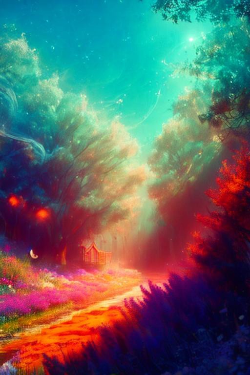 A mystical meadow, tucked away in a serene valley, brims with enchanting wildflowers and gentle rolling hills. The landscape is dotted with charming, whimsical cottages that seem to grow organically from the earth, their thatched roofs adorned with colorful blooms. Above, vibrant butterflies flit gracefully from flower to flower, their delicate wings catching the golden rays of the sun as it begins to set. The air is filled with the sweet fragrance of blooming lavender and the soft hum of bees busily gathering nectar. As the sun dips lower, the sky transforms into a canvas of warm oranges and soft pinks, casting a magical glow over the scene. Twinkling fairy lights are strung between the cottages, illuminating the pathway that winds through the meadow, inviting visitors to wander and explore. In the distance, a gentle stream meanders through the landscape, its surface sparkling like diamonds as it reflects the colors of the sky. The architecture of the cottages harmonizes with the natural surroundings, featuring rounded edges and earthy tones that blend seamlessly with the vibrant flora. A captivating interplay of light and shadow dances across the meadow, enhancing the enchanting atmosphere and inviting a sense of peace and tranquility. This idyllic setting, a masterpiece of soft pastels and lush greens, evokes a sense of wonder and adventure, beckoning all who enter to discover the beauty and magic of this hidden haven.