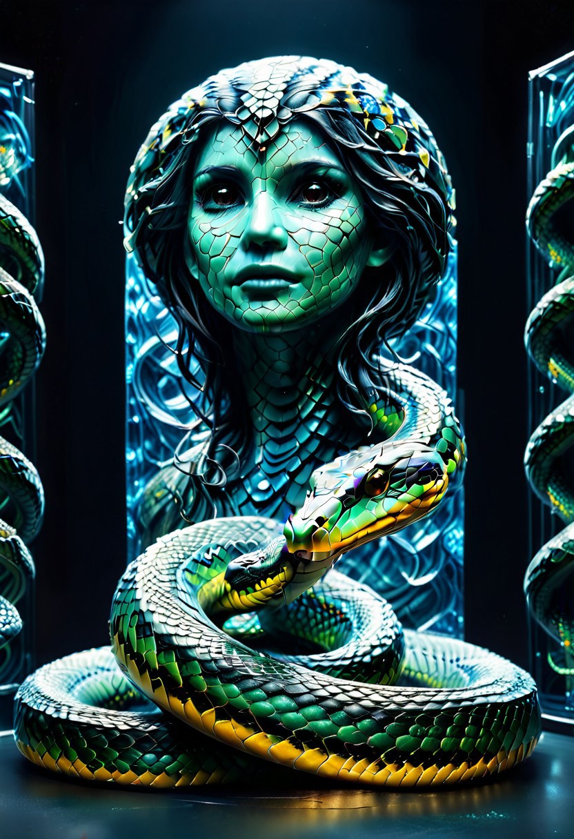 "A hyperrealistic life-size sculpture of a human morphing into a snake, each scale containing tiny holographic scenes of daily human life, glowing under soft, eerie lighting, surrounded by discarded skin, detailed scales, mixed with a high-tech futuristic vibe, surreal and unsettling atmosphere, photorealistic textures." <lora:SDXLFaeTastic2400:0.4> <lora:extremely_detailed:0.4> extremely detailed, <lora:sn4ke:1>,sn4ke, Masterpiece,best quality,hi res,8k,hi res,8k,award winning,(sharp focus, intricate, highly detailed), (extremely detailed, sn4ke)