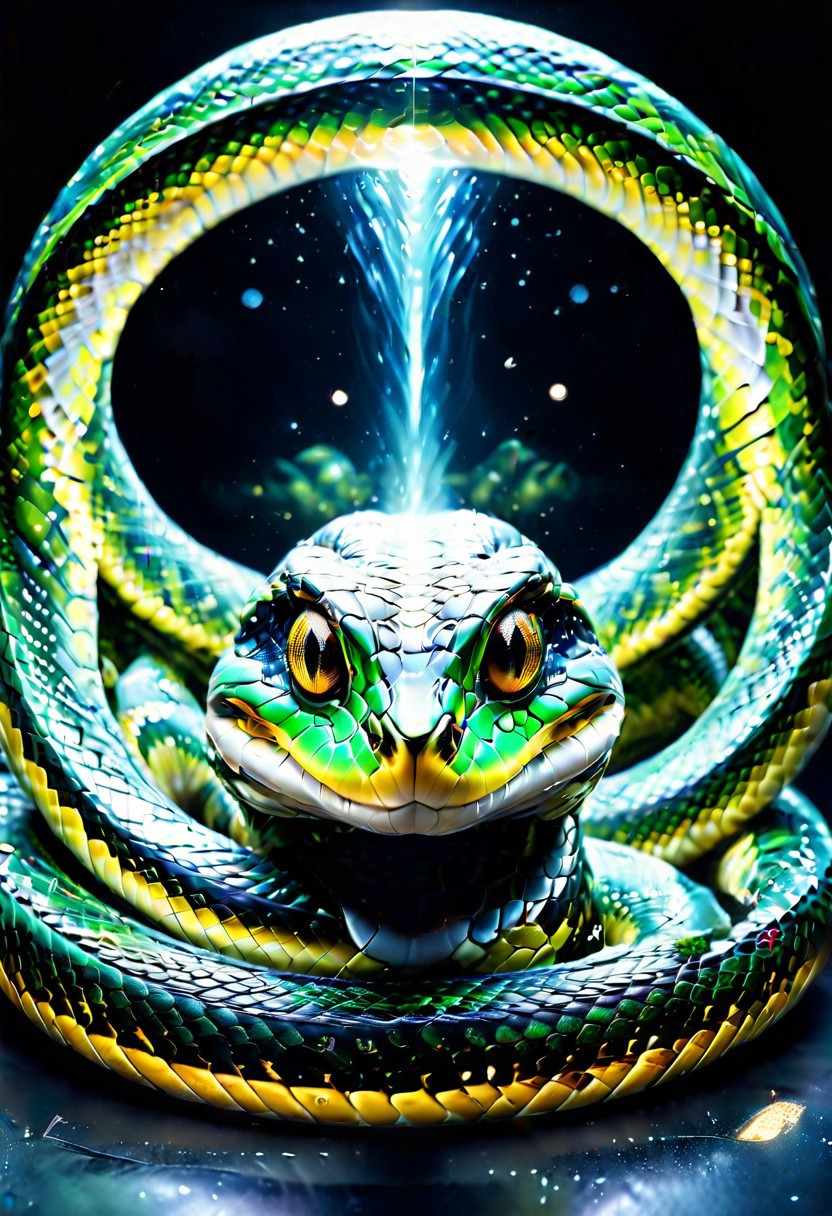 "A hyperrealistic life-size sculpture of a human morphing into a snake, each scale containing tiny holographic scenes of daily human life, glowing under soft, eerie lighting, surrounded by discarded skin, detailed scales, mixed with a high-tech futuristic vibe, surreal and unsettling atmosphere, photorealistic textures." <lora:SDXLFaeTastic2400:0.4> <lora:extremely_detailed:0.4> extremely detailed, <lora:sn4ke:1>,sn4ke, Masterpiece,best quality,hi res,8k,hi res,8k,award winning,(sharp focus, intricate, highly detailed), (extremely detailed, sn4ke, fntsylghtshwCE_style)