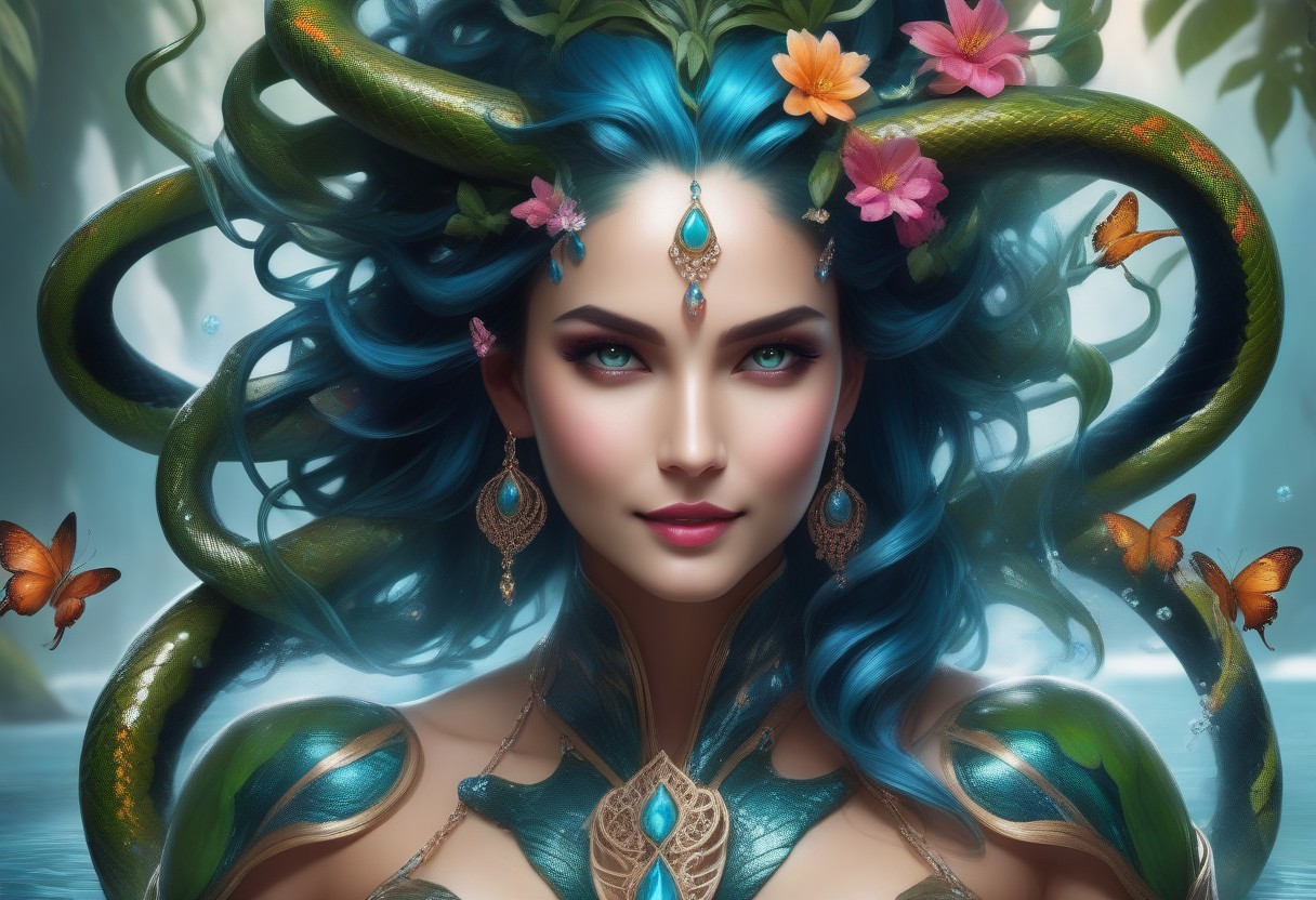 A humanoid female snake, with vibrant green snake skin, and six human arms. Each arm is holding a playful object like a bouquet of flowers, a paintbrush, and a musical instrument. She is cute, attractive with a slender athletic build and sharp, intelligent blue eyes, giving a hint of both charm and seduction. has long, flowing sandy blonde hair adorned with intricate hair charms, and a radiant smile. Her elegant horns curve gracefully from her forehead. Her eyeliner is bold and winged, extending outward to create a fierce and enchanting look as well as touch of shimmering highlighter on the inner corners of her eyes, enhancing their mystical glow.. Her long snake-like trail extending from her body, elegantly coiling around her. She wears traditional Indian jewelry, including a nose ring and earrings. The background is a lush jungle forest with colorful flowers and butterflies, creating a joyful and enchanting atmosphere. Ultra detailed, ultra high resolution, realistic masterpiece, best quality, full profile, beautiful detailed shiny eyes, beautifully detailed skin, depth of field, bokeh, elegant, picturesque.