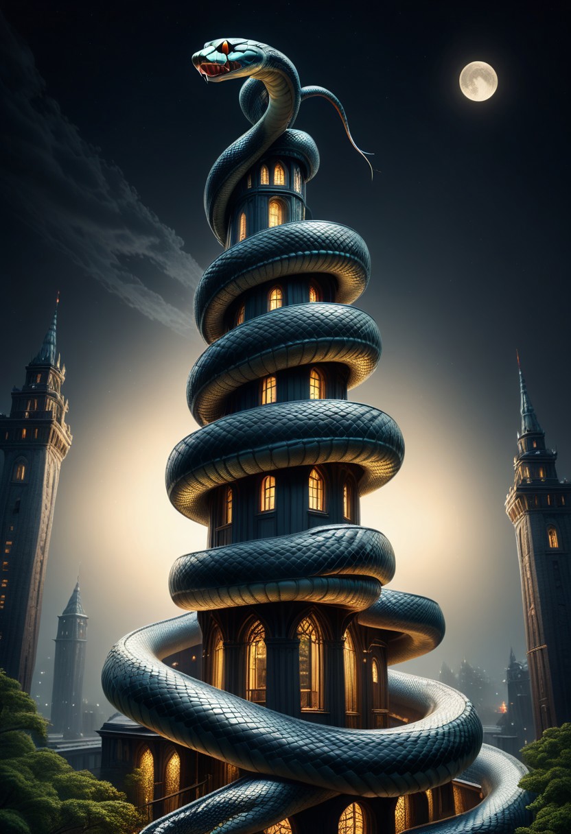 tower, giant snake, glowing eyes, night sky, full moon, extremely detailed, sn4ke, Masterpiece,best quality,hi res,8k,award winning,sharp focus, intricate, highly detailed