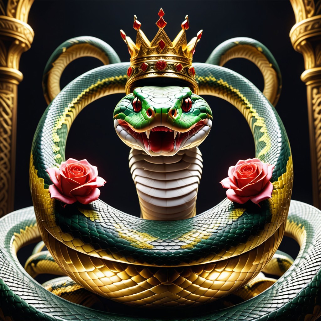 golden crown, red roses, snake, extremely detailed, sn4ke, Masterpiece,best quality,hi res,8k,award winning,sharp focus, intricate, highly detailed