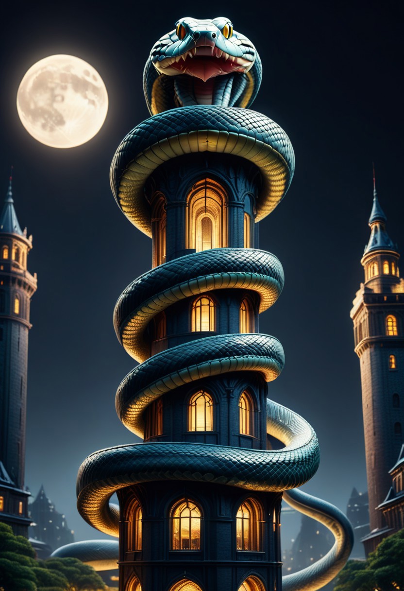 tower, giant snake, glowing eyes, night sky, full moon, extremely detailed, sn4ke, Masterpiece,best quality,hi res,8k,award winning,sharp focus, intricate, highly detailed